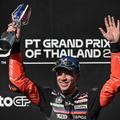 Le pilote italien d’Aprilia Marco Bezzecchi célèbre sa victoire sur le Grand Prix de MotoGP de Thaïlande, à Burinam, dimanche 1er mars 2026. LILLIAN SUWANRUMPHA / AFP