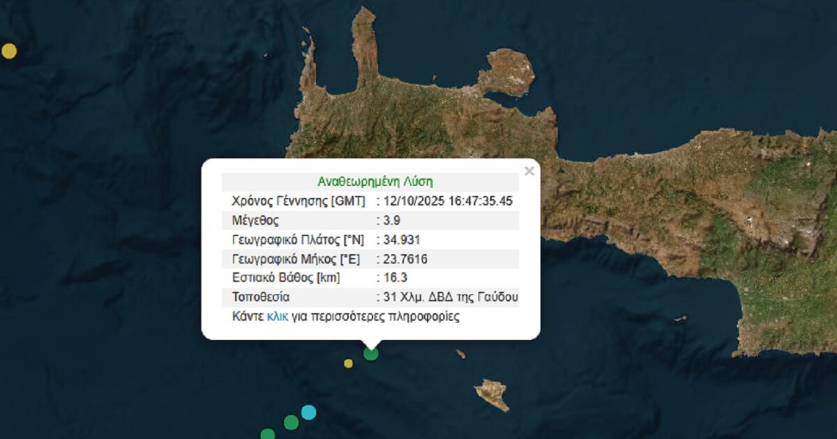 Σεισμός 3,9 Ρίχτερ σημειώθηκε το απόγευμα της Κυριακής 12 Οκτωβρίου νότια της Κρήτης και κοντά στη Γαύδο.