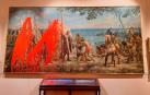 Protesta Dos activistas de Futuro Vegetal atacan un cuadro de Colón en el Museo Naval de Madrid La pintura ha dañado la mitad izquierda del cuadro 'Primer homenaje a Cristóbal Colón', de José Garnelo Ampliar Dos activistas del movimiento de desobediencia...