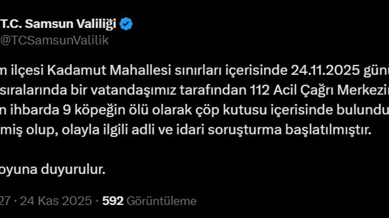Samsun'da 9 köpek çöp kutusunda ölü bulundu. Valilikten yapılan açıklamada olayla ilgili adli ve idari soruşturma başlatıldığı duyuruldu.