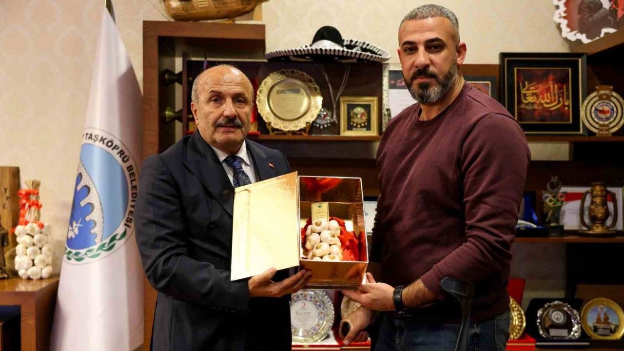 TAŞKÖPRÜ BELEDİYE BAŞKANI ARSLAN, SAMİ SHEHADA’YA TAŞKÖPRÜ’NÜN SİMGESİ OLAN SARIMSAK BİBLOSU HEDİYE ETTİ.