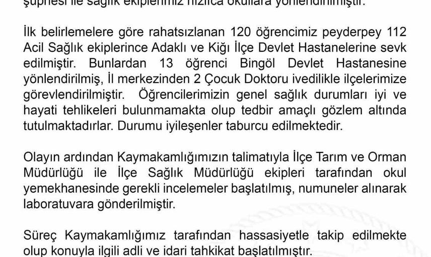 Bingöl’ün Adaklı ilçesindeki Yatılı Bölge Ortaokulu ve Şehit Hikmet Saydan İlkokulu’nda öğle yemeği sonrası rahatsızlanan 120 öğrenci, gıda zehirlenmesi şüphesiyle hastaneye kaldırıldı. Valilik, öğrencilerin genel sağlık durumlarının iyi olduğunu ve...