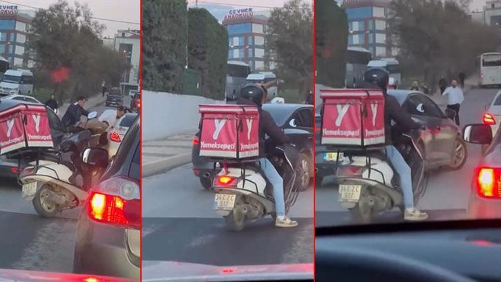 İstanbul'da trafikte motosikletli ile cip sürücüsü arasında çıkan yol verme tartışmasını kavgaya dönüşürken; o anlar kameralarca kaydedildi.