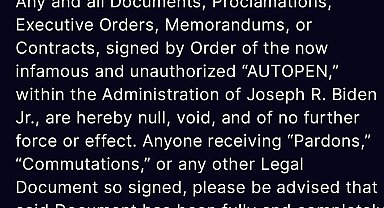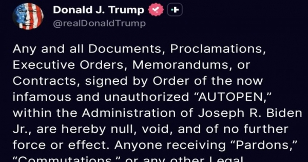 ABD Başkanı Donald Trump, selefi Joe Biden döneminde "Autopen" (imza makinesi) ile imzalanmış tüm belgelerin artık geçersiz olduğunu belirterek, "Af, ceza indirimi veya bu şekilde imzalanmış başka bir belge alan herkes, söz konusu belgenin hiçbir yasal...
