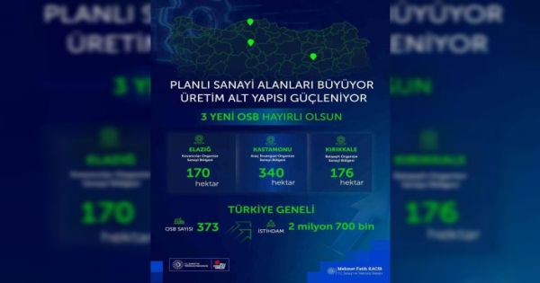 Sanayi ve Teknoloji Bakanı Mehmet Fatih Kacır, Elazığ, Kastamonu ve Kırıkkale'de kurulan 3 yeni Organize Sanayi Bölgesi (OSB) ile Türkiye genelindeki OSB sayısının 373'e yükseldiğini duyurdu.