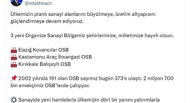 Sanayi ve Teknoloji Bakanı Mehmet Fatih Kacır, '3 yeni Organize Sanayi Bölgemiz şehirlerimize, milletimize hayırlı olsun. Elazığ Kovancılar OSB, Kastamonu Araç İhsangazi OSB, Kırıkkale Balışeyh OSB' dedi.
