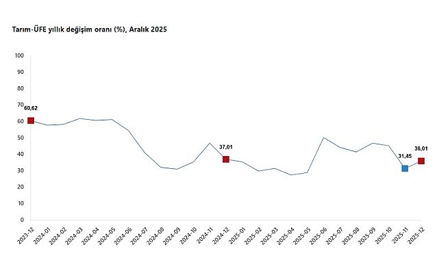 TÜİK verilerine göre Tarım-ÜFE, 2025 yılı Aralık ayında aylık yüzde 3,06, yıllık ise yüzde 36,01 artış kaydetti.