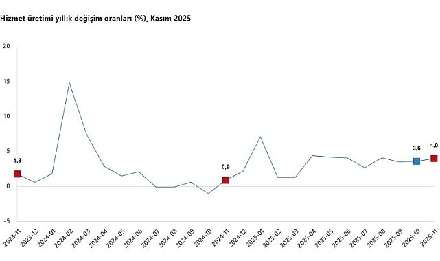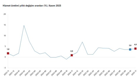 Türkiye İstatistik Kurumu'nun (TÜİK) açıkladığı veriye göre hizmet üretim endeksi 2025 yılı Kasım ayında bir önceki yılın aynı ayına göre yüzde 4,0 arttı.