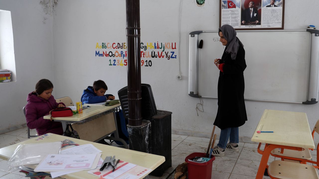 Feke'de eksi 20 derecede, tek öğretmen Sena Moroğlu, 6 öğrencisi için odun kırıp soba yakarak eğitimi sürdürüyor.