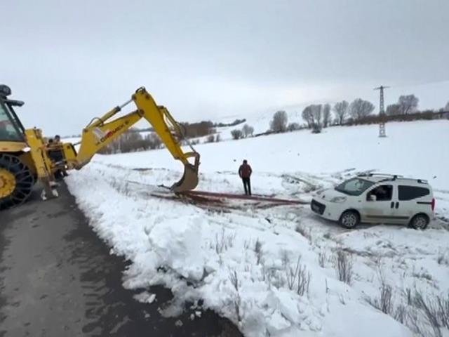Akyaka'da buzlanma nedeniyle yoldan çıkan araç şarampole uçtu, Özel İdare ekipleri aracı kurtardı.