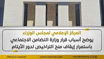 نشر المركز الإعلامي لمجلس الوزراء بيانًا عبر منصاته على مواقع التواصل الاجتماعي، أوضح من خلاله الهدف من قرار وزارة التضامن الاجتماعي باستمرار إيقاف منح التراخيص لدور الأيتام.
