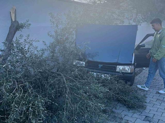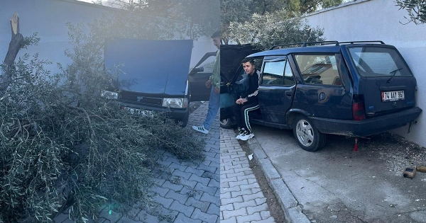 Denizli’de süratli otomobil duramayınca önce zeytin ağacına, ardından duvara çarparak durabildi.