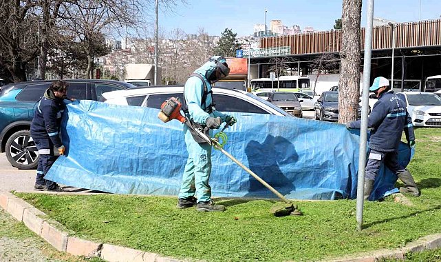 Kocaeli’de yeşil alan bakımlarında araçlar brandalarla korunuyor
