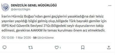 Denizcilik Genel Müdürlüğü, İran'ın Hürmüz Boğazı'ndan gemi geçişlerini yasakladığına dair telsiz anonsları yapıldığı bilgisinin alındığını ve bölgedeki Türk bayraklı gemiler için ISPS güvenlik seviyesinin 3 olduğunu bildirdi.