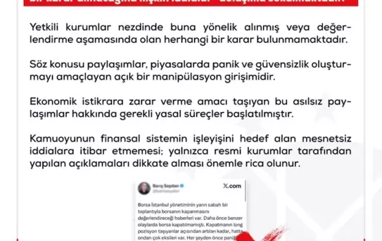 Merkezin sosyal medya hesabından yapılan açıklamada, yetkili kurumlar nezdinde Borsa İstanbul'un işlemlere kapatılmasına yönelik alınmış ya da değerlendirme aşamasında olan herhangi bir karar bulunmadığı belirtildi.