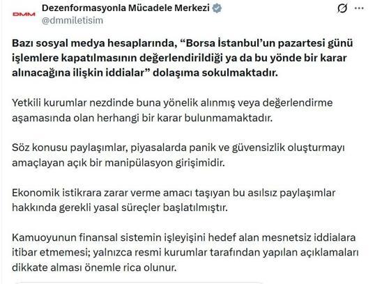 DMM'nin NSosyal hesabından yapılan paylaşımda, "Borsa İstanbul'un pazartesi günü işlemlere kapatılmasının değerlendirildiğine ya da bu yönde bir karar alınacağına" ilişkin iddiaların bazı sosyal medya hesaplarından dolaşıma sokulduğu belirtildi.