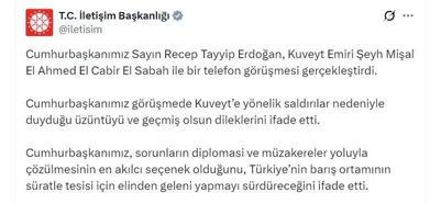 İletişim Başkanlığının sosyal medya hesabından yapılan paylaşımda, "Cumhurbaşkanımız Sayın Recep Tayyip Erdoğan, Kuveyt Emiri Şeyh Mişal El Ahmed El Cabir El Sabah ile bir telefon görüşmesi gerçekleştirdi. Cumhurbaşkanımız görüşmede Kuveyt’e yönelik...