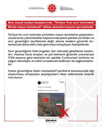 Dezenformasyonla Mücadele Merkezi tarafından yapılan açıklamada, "Bazı sosyal medya hesaplarında ‘Türkiye-İran sınır hattındaki 80 bin mayın temizlendi’ iddiası dezenformasyon içermektedir" denildi.