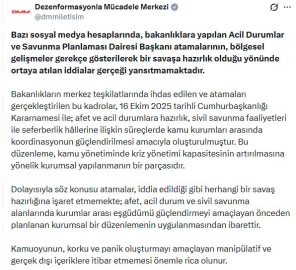 İletişim Başkanlığı Dezenformasyonla Mücadele Merkezi, bazı bakanlıklara yapılan Acil Durumlar ve Savunma Planlaması Dairesi Başkanı atamalarının savaş hazırlığı olduğu yönündeki iddiaların gerçeği yansıtmadığını açıkladı.