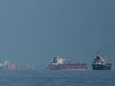 Oil tankers and cargo ships line up in the Strait of Hormuz as seen from Khor Fakkan, United Arab Emirates,...