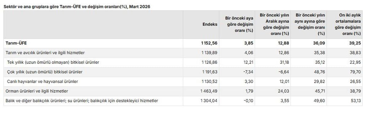 Türkiye İstatistik Kurumu verilerine göre Tarım-ÜFE, Mart 2026’da yıllık yüzde 36,09, aylık yüzde 3,85 arttı.