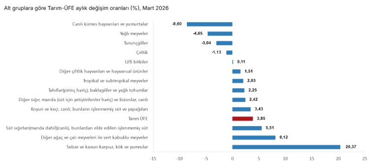 Tarım ürünleri üretici fiyat endeksinin yıllık yüzde 36,09, aylık yüzde 3,85 arttığı Mart 2026’da, yıllık değişimin en yüksek olduğu alt grup yüzde 56,36 artış ile diğer ağaç ve çalı meyveleri ile sert kabuklu meyveler, aylık değişimin en yüksek olduğu...