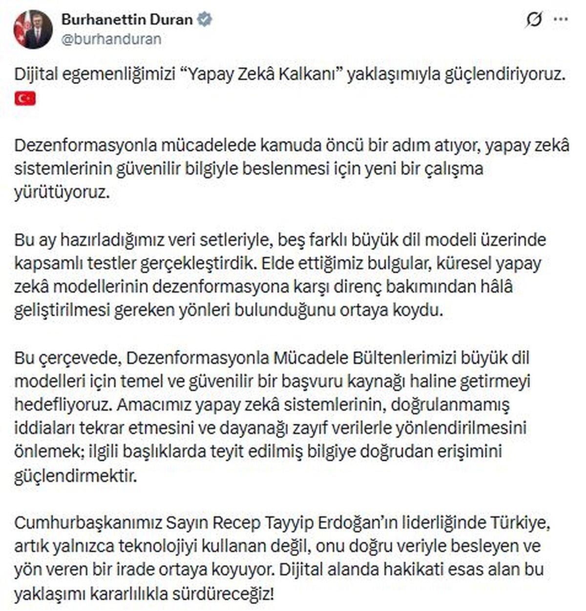 İletişim Başkanı Burhanettin Duran, "Dijital egemenliğimizi Yapay Zekâ Kalkanı yaklaşımıyla güçlendiriyoruz. Dezenformasyonla mücadelede kamuda öncü bir adım atıyor, yapay zeka sistemlerinin güvenilir bilgiyle beslenmesi için yeni bir çalışma...