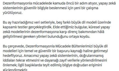 Dezenformasyonla mücadelede yeni bir dönem başlıyor. İletişim Başkanı Burhanettin Duran, sanal medya hesabından yaptığı açıklamada, yapay zeka sistemlerinin güvenilir bilgiyle beslenmesi için yeni bir çalışma yürüttüklerini açıkladı.