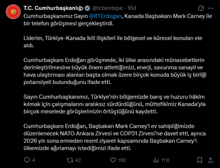 İletişim Başkanlığı'ndan yapılan açıklamada, "Cumhurbaşkanımız Sayın Recep Tayyip Erdoğan, Kanada Başbakanı Mark Carney ile bir telefon görüşmesi gerçekleştirdi. Liderler, Türkiye-Kanada ikili ilişkileri ile bölgesel ve küresel konuları ele aldı....