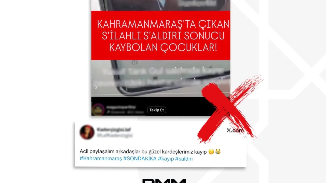 İletişim Başkanlığı Dezenformasyonla Mücadele Merkezi (DMM), Kahramanmaraş'taki olaya ilişkin sosyal medyada yer alan 'saldırı sonucu kayıp çocuklar var' iddialarının gerçeği yansıtmadığını açıkladı.