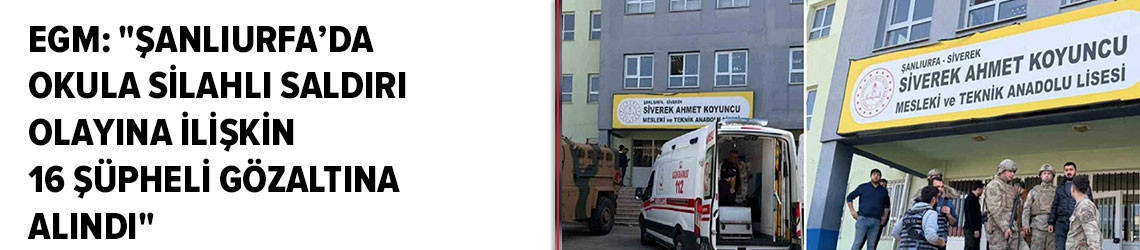 Türkiye Emniyet Genel Müdürlüğü (EGM), Şanlıurfa'nın Siverek ilçesinde bulunan Ahmet Koyuncu Mesleki ve Teknik Anadolu Lisesi'ndeki silahlı saldırıya ilişkin 16 şüphelinin gözaltına alındığını bildirdi.