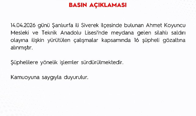 Emniyet Genel Müdürlüğü’nün yaptığı açıklamada, "14.04.2026 günü Şanlıurfa ili Siverek ilçesinde bulunan Ahmet Koyuncu Mesleki ve Teknik Anadolu Lisesi’nde meydana gelen silahlı saldırı olayına ilişkin yürütülen çalışmalar kapsamında 16 şüpheli gözaltına...