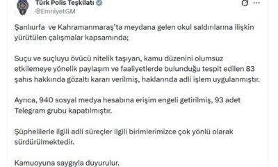 Emniyet Genel Müdürlüğü, Şanlıurfa ve Kahramanmaraş’taki okul saldırılarının ardından yürütülen soruşturmalar kapsamında, “suçu ve suçluyu övücü” paylaşımlar yaptığı tespit edilen 83 kişi hakkında gözaltı kararı verildiğini açıkladı. Ayrıca 940 sosyal...