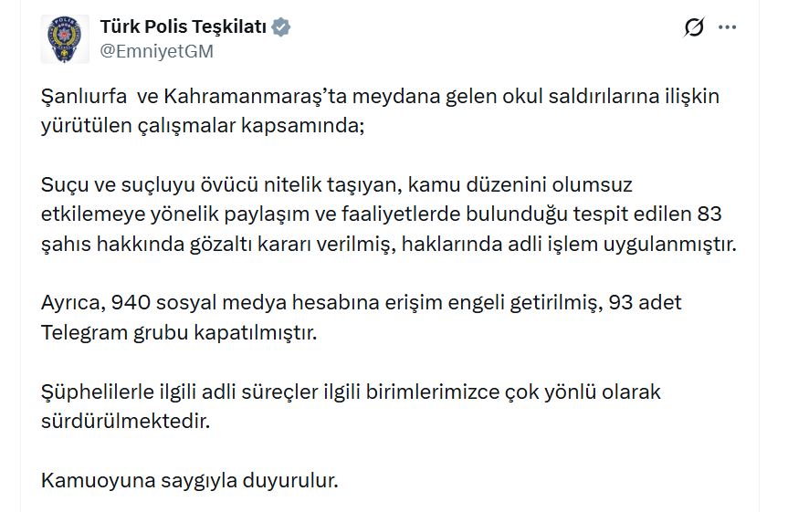 Emniyet Genel Müdürlüğü (EGM), Şanlıurfa ve Kahramanmaraş'ta meydana gelen okul saldırılarına ilişkin, "Suçu ve suçluyu övücü nitelik taşıyan, kamu düzenini olumsuz etkilemeye yönelik paylaşım ve faaliyetlerde bulunduğu tespit edilen 83 şahıs hakkında...