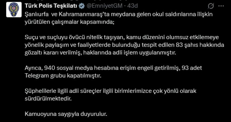 Emniyet Genel Müdürlüğü, Şanlıurfa ve Kahramanmaraş’taki okul saldırılarına ilişkin yürütülen çalışmalar kapsamında suçu öven paylaşımlara yönelik geniş çaplı işlem başlattı. 940 sosyal medya hesabına engel getirilirken, 93 Telegram grubu da...
