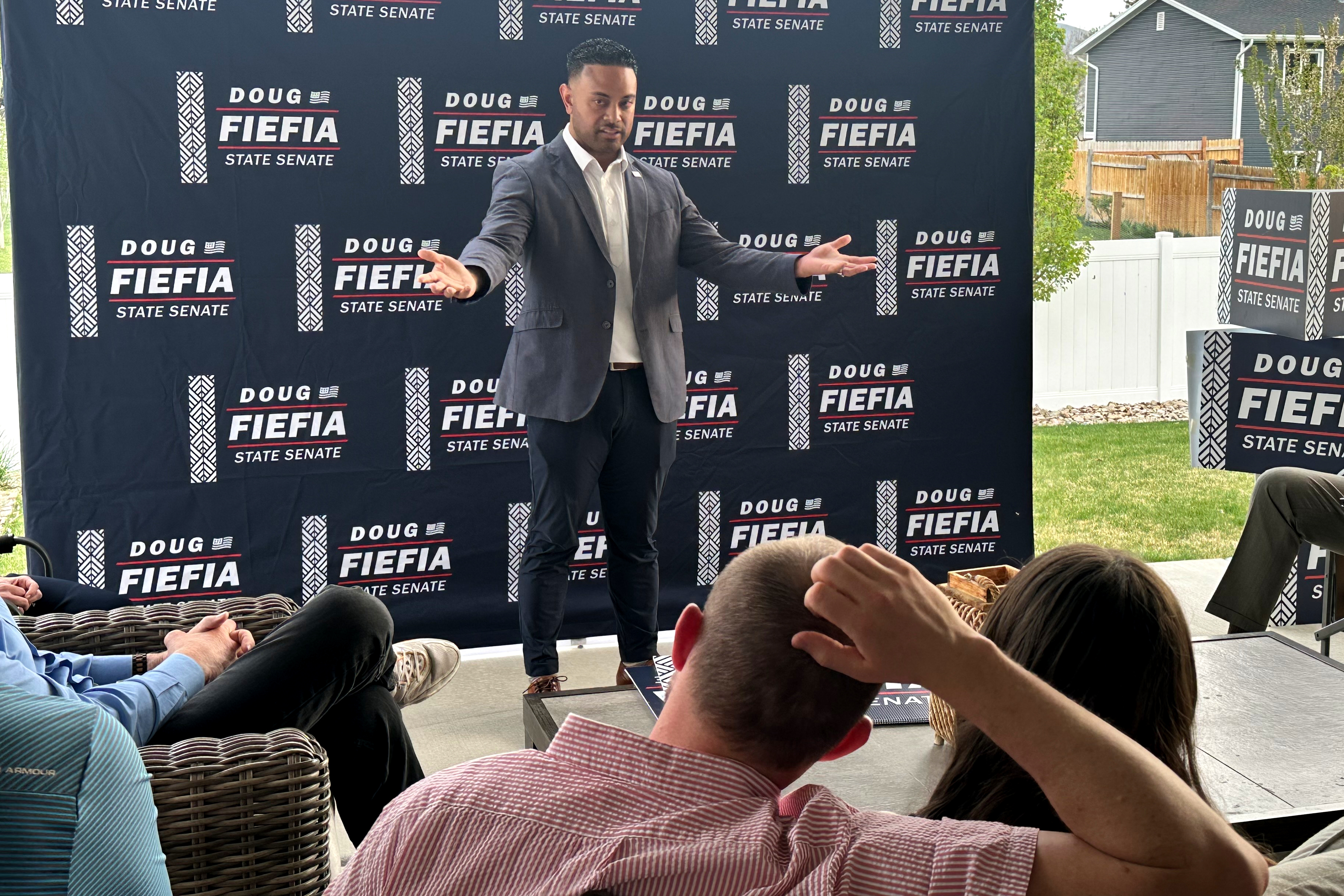 Utah State Rep. Doug Fiefia talks to Utah voters on the back deck of a house, Thursday, April 9, 2026, in Riverton, Utah. Fiefia, a...