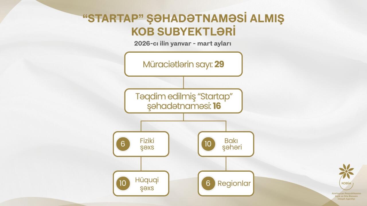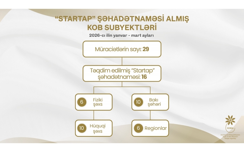 Milli.Az xəbər verir ki, 2026-cı ilin yanvar-mart aylarında 29 mikro və kiçik sahibkar "Startap" şəhadətnaməsi almaq üçün Kiçik və Orta Biznesin İnkişafı...