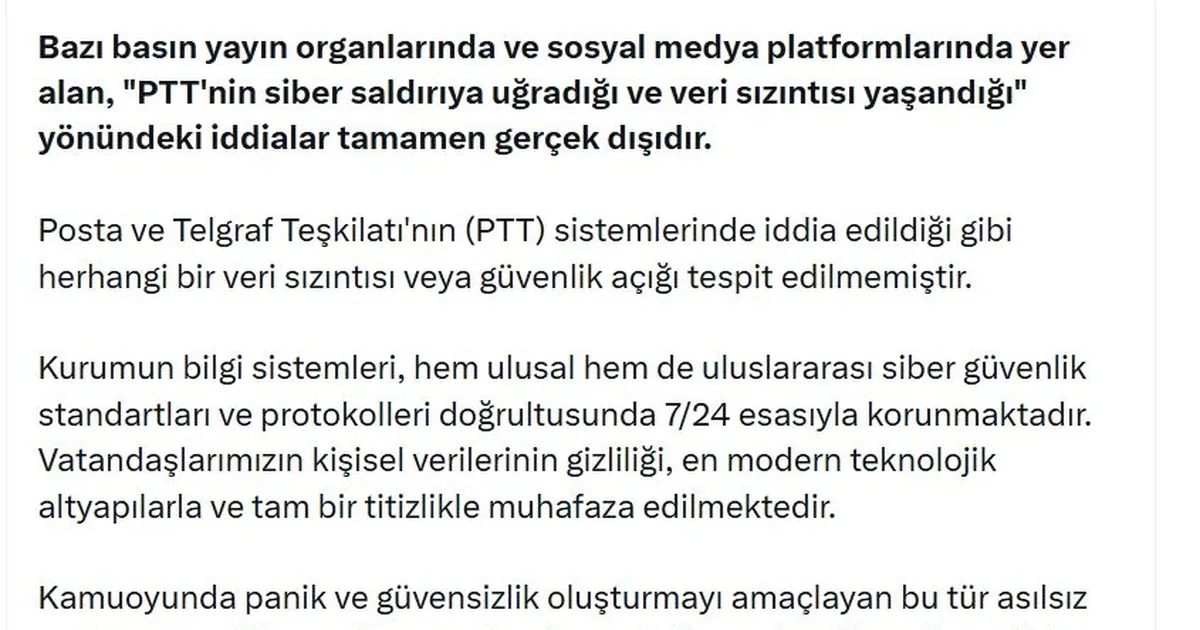 Dezenformasyonla Mücadele Merkezi, PTT'nin siber saldırıya uğradığı ve veri sızıntısı yaşandığı yönündeki iddiaların gerçek dışı olduğunu, kurum sistemlerinde herhangi bir güvenlik açığı bulunmadığını açıkladı.