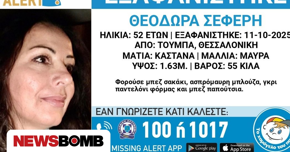 Η γυναίκα εξαφανίστηκε το Σάββατο 11 Οκτωβρίου 2025 στις 15:30 από την περιοχή της Τούμπας, σύμφωνα με ανακοίνωση του «Χαμόγελου του...