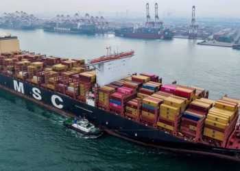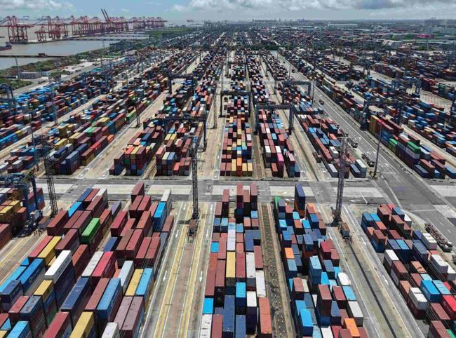 An aerial view of a container port is seen in Qingdao in east China’s Shandong province, on June 6, 2024. (Chinatopix via AP, File)