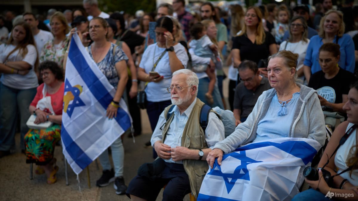 Attendees listen to a concert at a plaza known as hostages square, in Tel Aviv, Israel, Sunday, Oct 12, 2025....