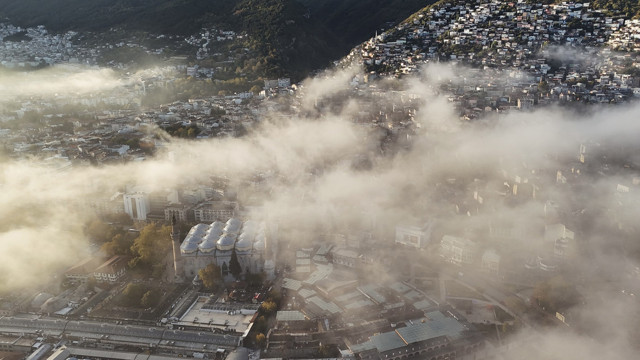 Bursa'da etkili olan yoğun sis, kartpostallık görüntüler ortaya koydu. Bursa'nın tarihi mekanları, Ulu Cami, Tophane ve diğer bölgeleri sis altında seyrine doyumsuz anları ortaya koydu.