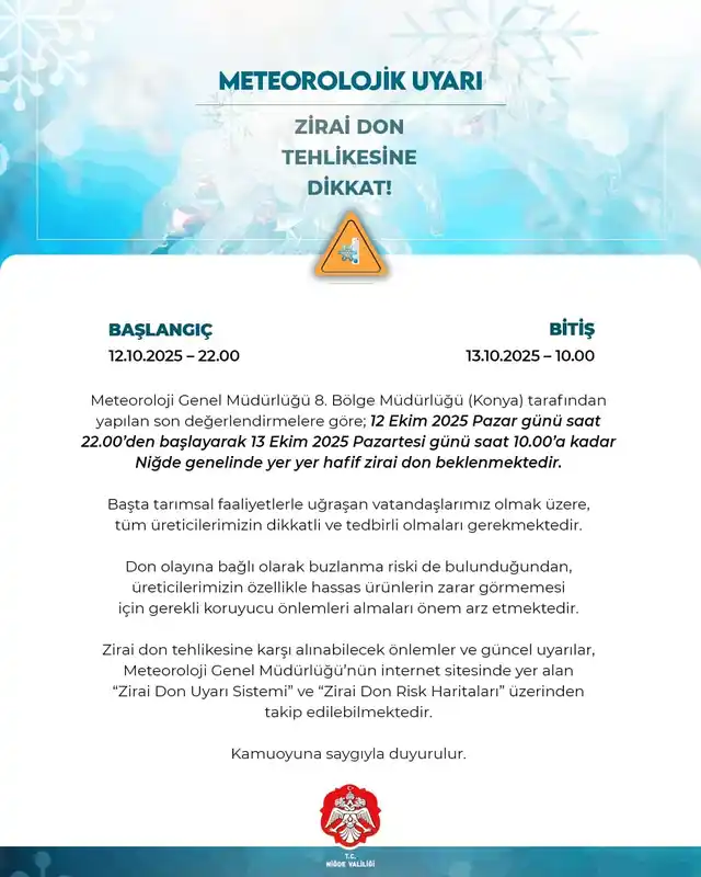 Niğde Valiliği, zirai don beklendiğini belirterek, üreticilere gerekli önlemleri almaları konusundan uyarıda bulundu.
