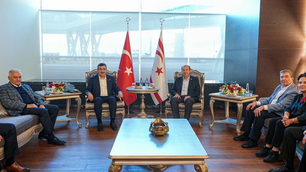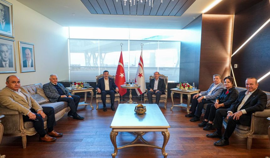 Cumhurbaşkanı Ersin Tatar, Türkiye Cumhurbaşkanı Yardımcısı Cevdet Yılmaz, Başbakan Ünal Üstel, Bakan Fikri Ataoğlu ve Binali Yıldırım, Ercan Havalimanı’ndaki toplantıda KKTC’nin Türk dünyasıyla ilişkileri, Gazze’deki ateşkes ve bölgesel gelişmeleri...