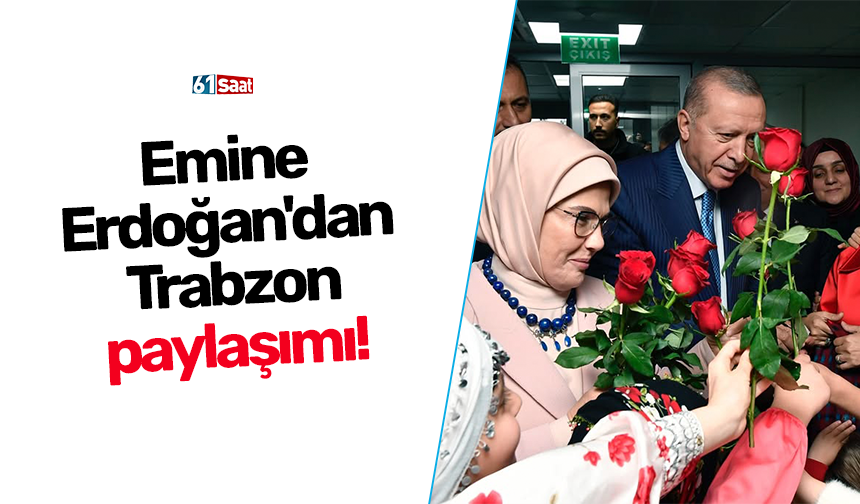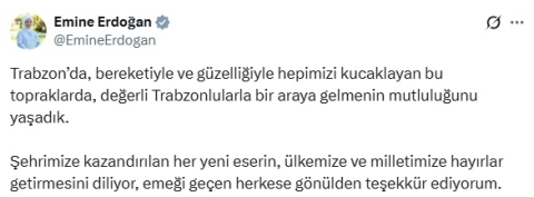 Başkanı Erdoğan'ın eşi Emine Erdoğan, Trabzon ziyaretiyle ilgili sosyal medya hesabından paylaşımda bulundu.