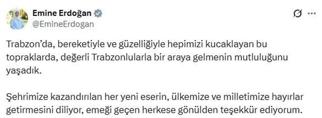 CUMHURBAŞKANI Recep Tayyip Erdoğan'ın eşi Emine Erdoğan, Trabzon ziyaretiyle ilgili sosyal medya hesabından paylaşımda bulundu.