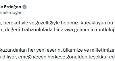 Cumhurbaşkanı Recep Tayyip Erdoğan’ın eşi Emine Erdoğan, Trabzon ziyaretine dair sosyal medya hesabından anlamlı bir mesaj paylaştı. Erdoğan, şehre kazandırılan yeni eserlerin “ülkeye ve millete hayırlar getirmesini” diledi.