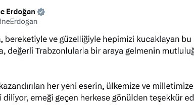 Trabzon'a, yapımı tamamlanan tesis ve projelerin açılış töreni için giden Cumhurbaşkanı Erdoğan'a eşlik eden Emine Erdoğan, sosyal medya hesabından yaptığı paylaşımda, "Trabzon'da, bereketiyle ve güzelliğiyle hepimizi kucaklayan bu topraklarda, değerli...