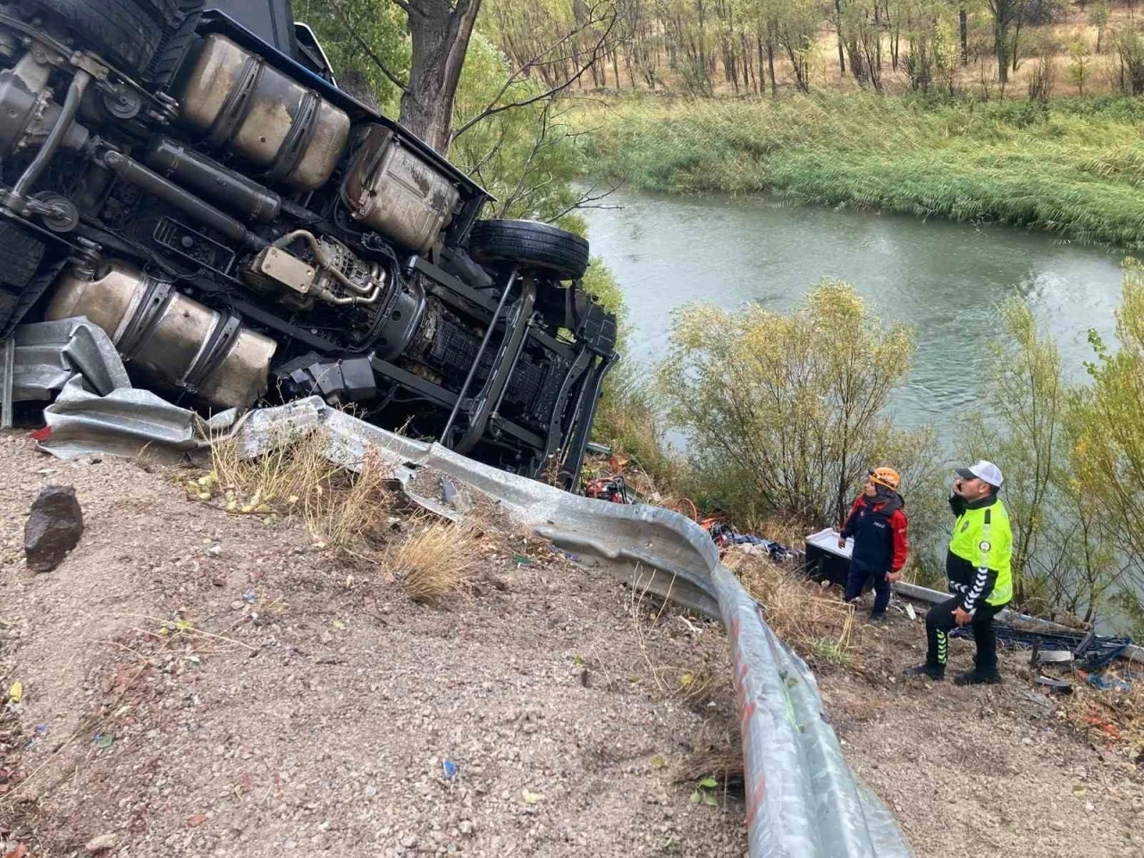 Kaza, saat 15.00 sıralarında D-100 kara yolu Aşağıkale Mahallesi Tünel mevkiinde meydana geldi. Sağanak yağış nedeniyle Y.Y.’nin kontrolünü yitirdiği 31 AKZ 263 plakalı sebze yüklü TIR bariyerlere çarparak Kelkit Çayı kenarına devrildi. İhbar üzerine...