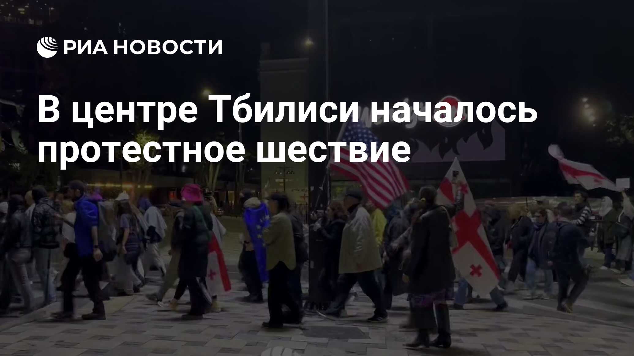 Протестующие двинулись от парка Вере к центру города. Они несут флаги Грузии, Евросоюза. Также в колонне видны флаги США и Украины. Полиции рядом с местом проведения акции нет,...